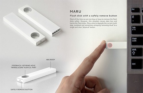 這款U盤是由一位名叫Ahmet Burak Aktas的網友設計。其外形看起來跟普通U盤相差不大,但是尾部處有一個按鈕,使用完之后,按一下就可以從電腦彈出,直接就可以拔掉。