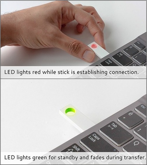 這款U盤還有一個圓形指示燈,會發出紅色或綠色的光。當插入U盤時,紅燈亮表示正在建立連接;在數據傳輸過程中,綠燈則不停的閃爍;在按下彈出按鈕時,紅色會亮,然后就能安全取出U盤,之后燈則會熄滅。